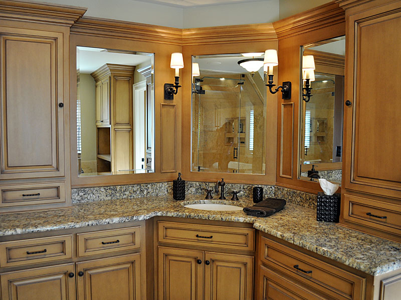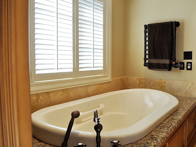 Oil rubbed bronze fixtures with custom glazed cabinets, spa air tub, heated towel bar, travertine floor and shower give a European feel to this master bath. The shower,equipped with multiple shower heads, steam unit and heated floor are added luxuries to this space.