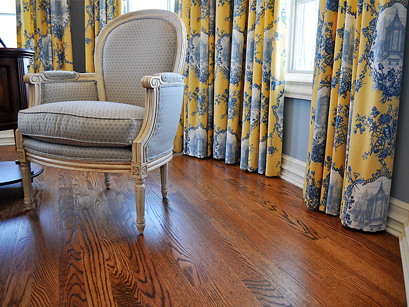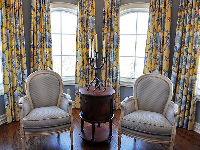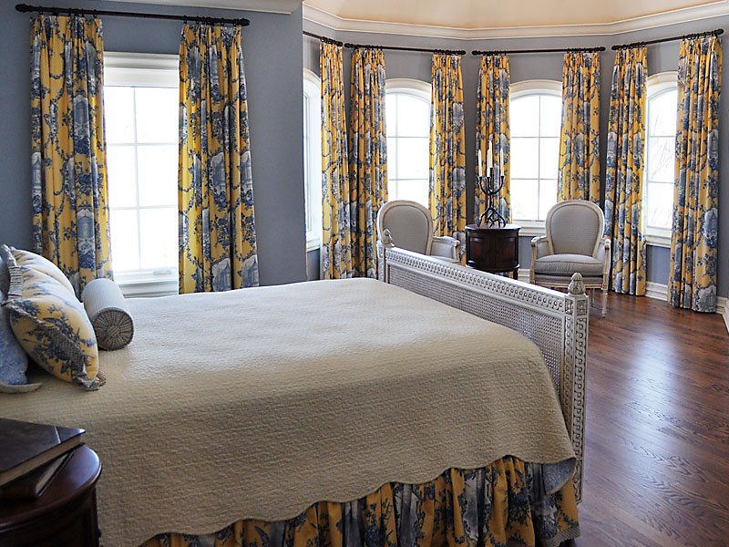 One’s attention is immediately drawn to the French blue and yellow toile custom drapery and bedding. French Heritage furniture finished in white with custom upholstery, add a dramatic contrast with both wall and floor finishes. This room breaths relaxation, comfort and French charm which any guest will surely welcome.